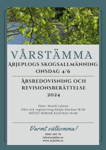 Vårstämma Arjeplogs skogsallmänning Klockan 19.00. Gemensamt fika och registrering från klockan 18.30.